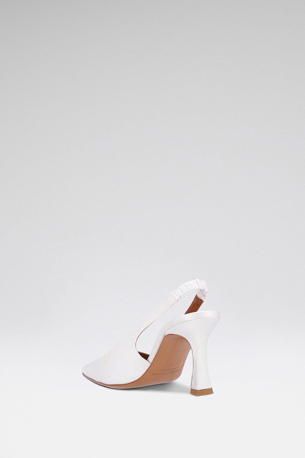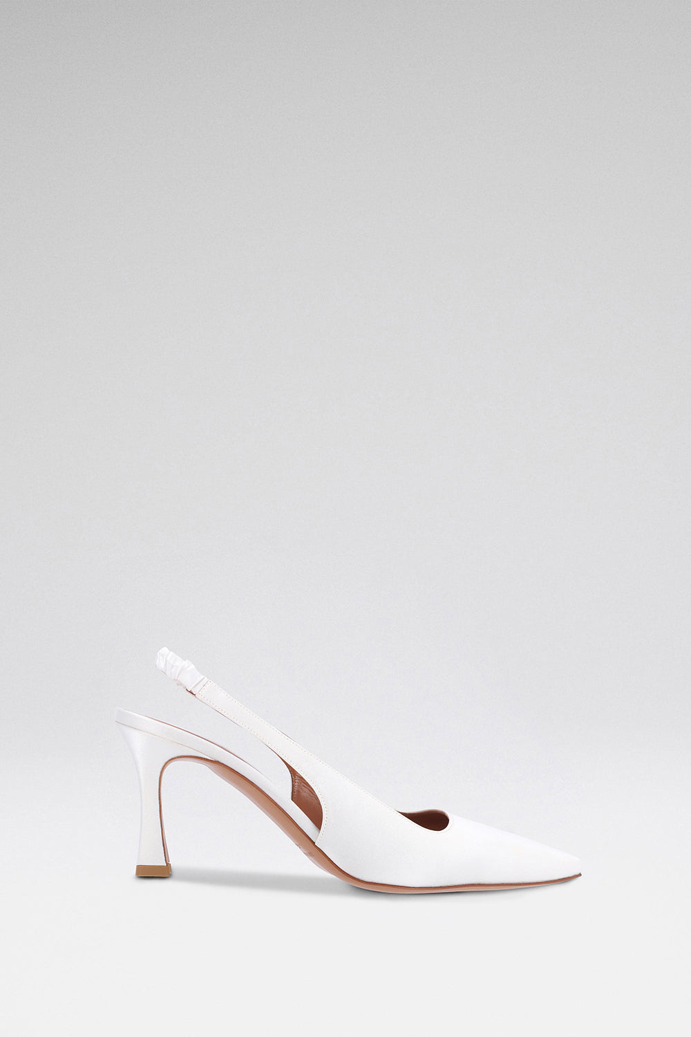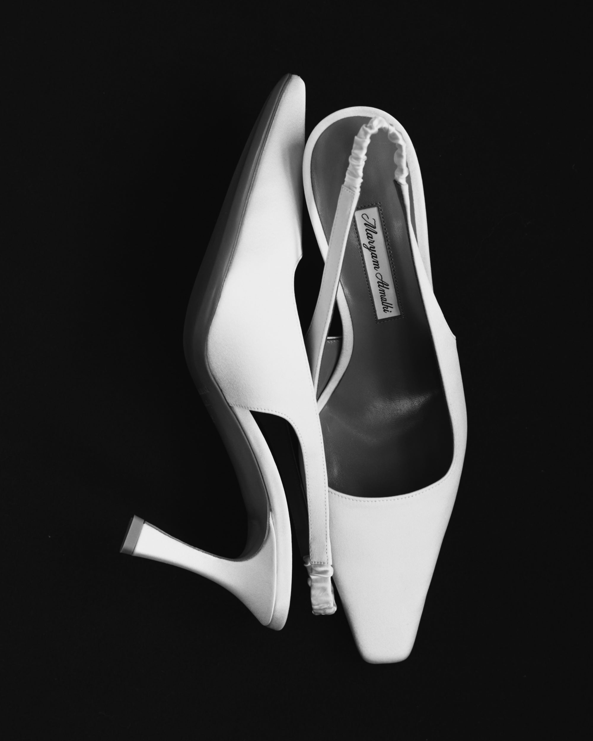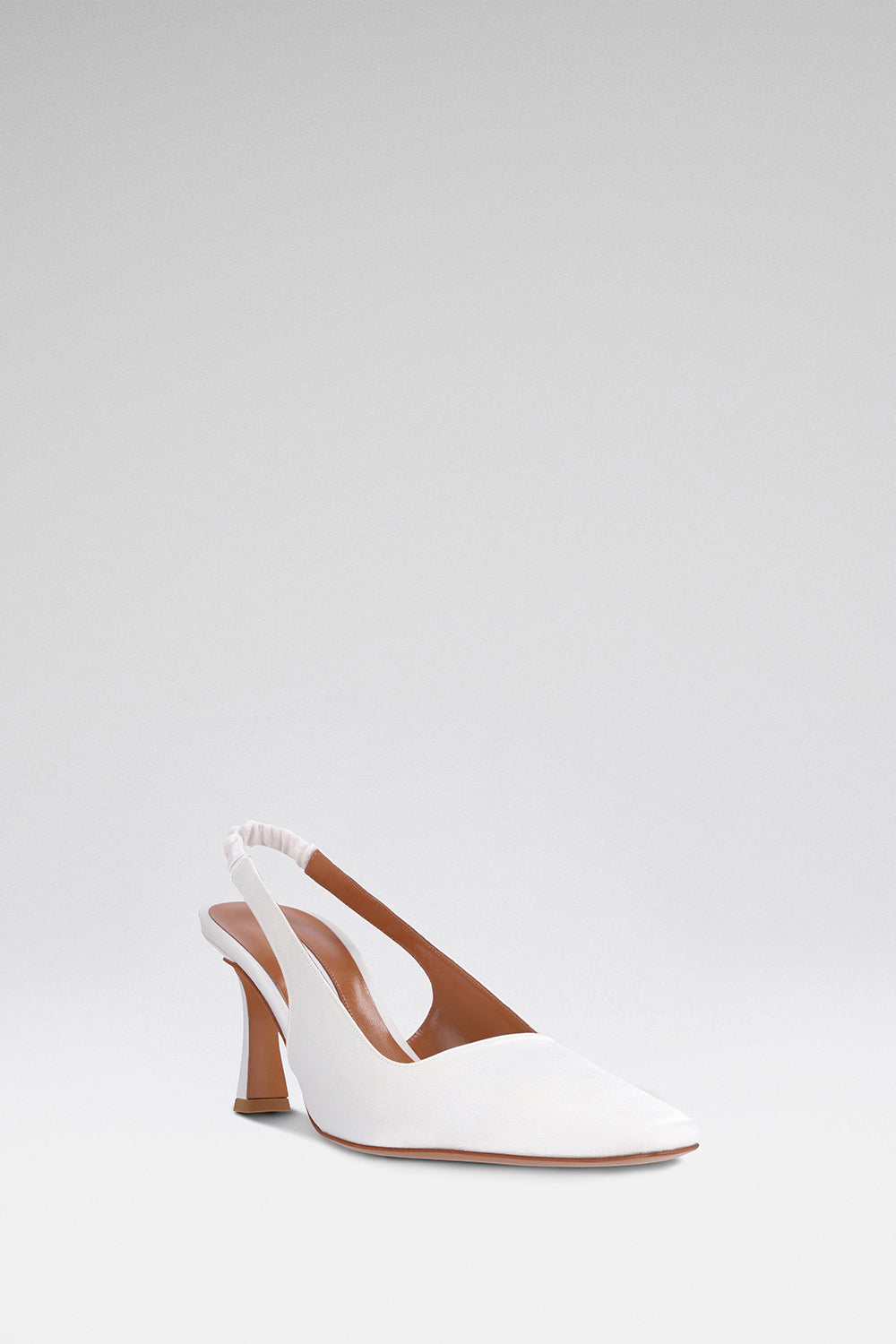 Step into the timeless allure of Carolyn – a classic '90s-inspired slingback pump that embodies the essence of elegance. Crafted in luxe ivory satin with a tan leather lining and a slightly squared toe, this design pays homage to Carolyn Bessette's legacy of style, reimagined for the modern bride.