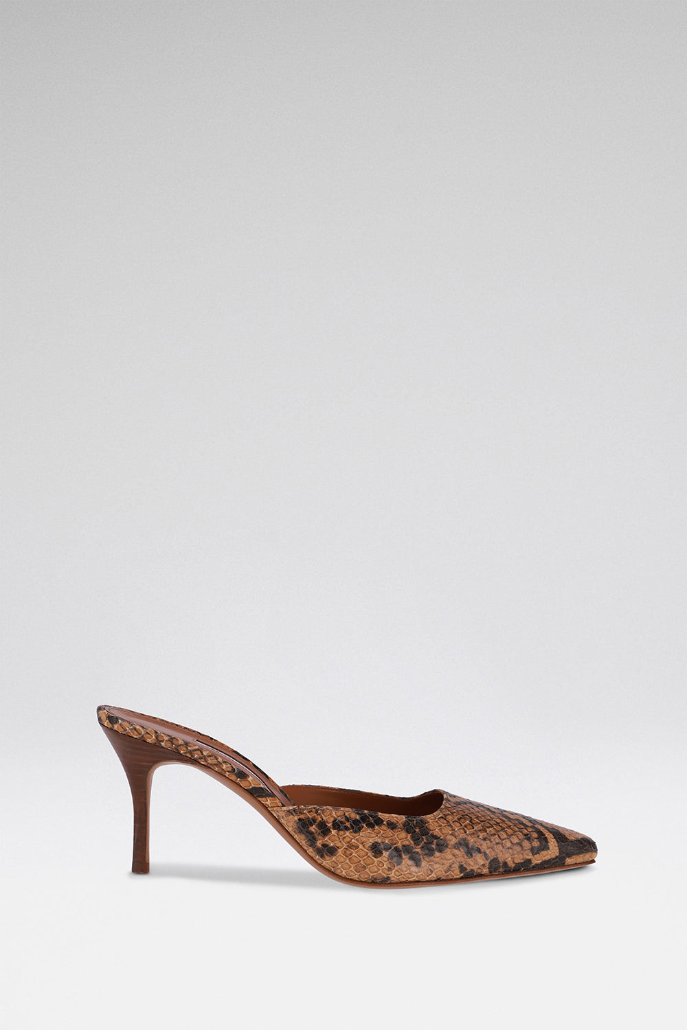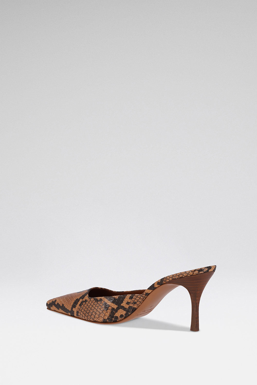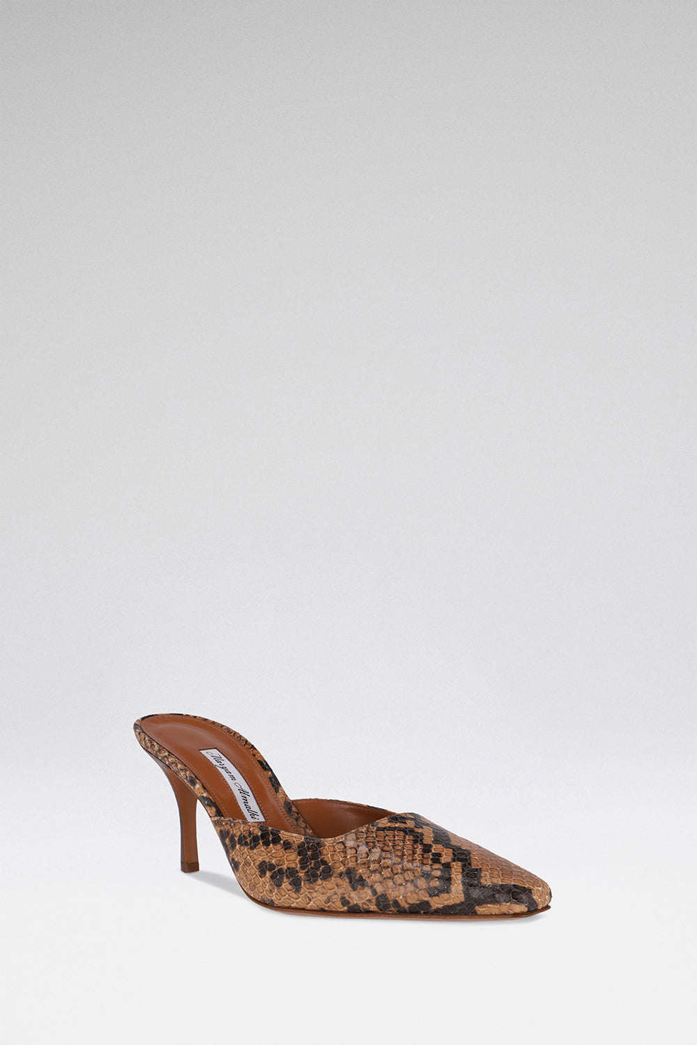 Tan python-embossed leather. 75mm heel. Signature square-toe mule. Finished by hand in Italy.