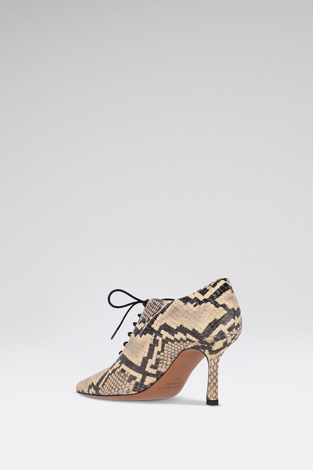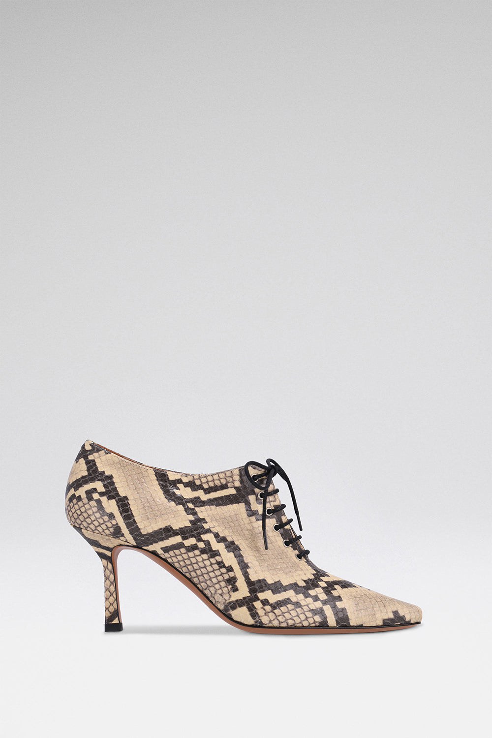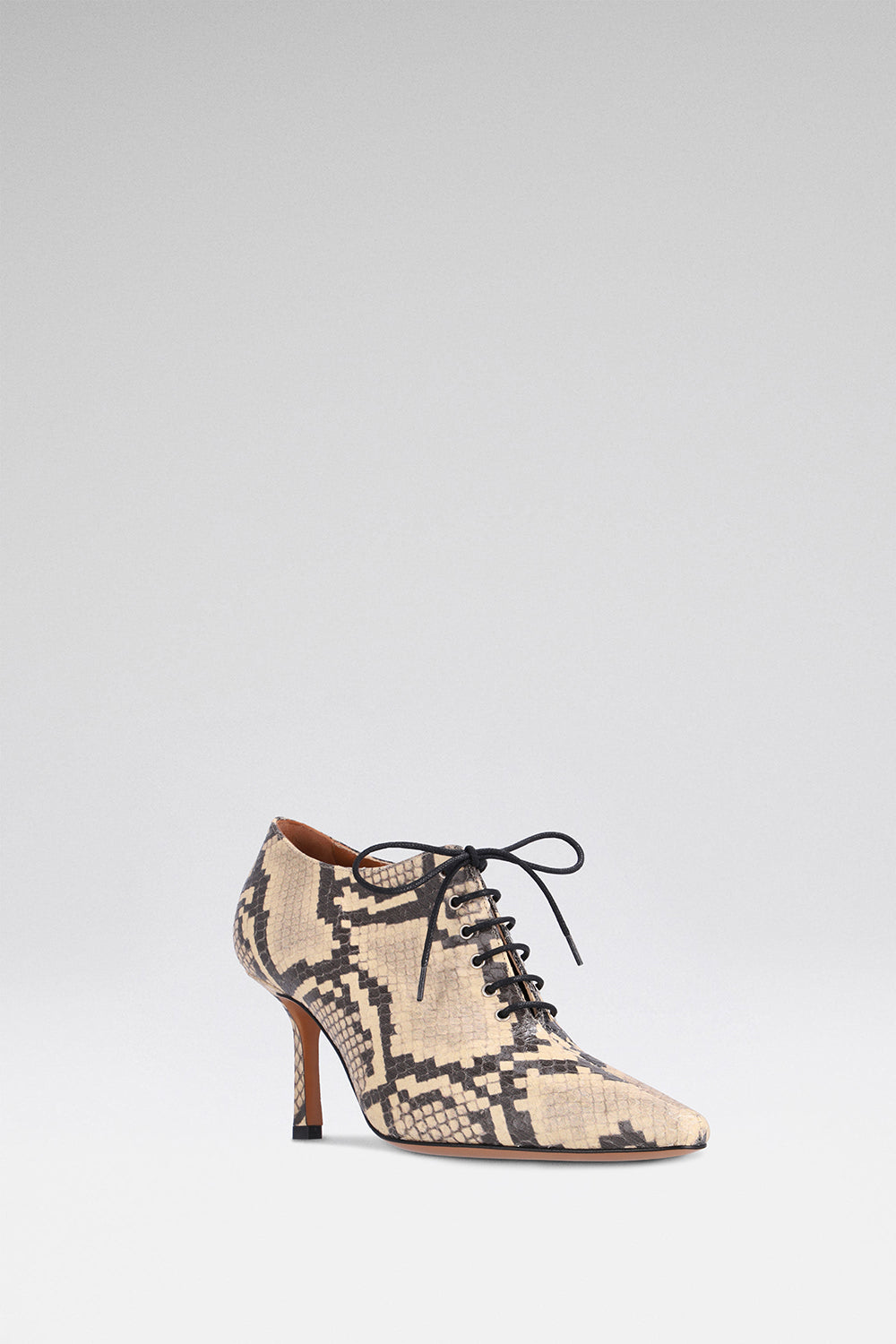 Beige python-embossed leather. Pointed-toe ankle boot with lace front and silver eyelets. 75mm heel. Finished by hand in Italy.