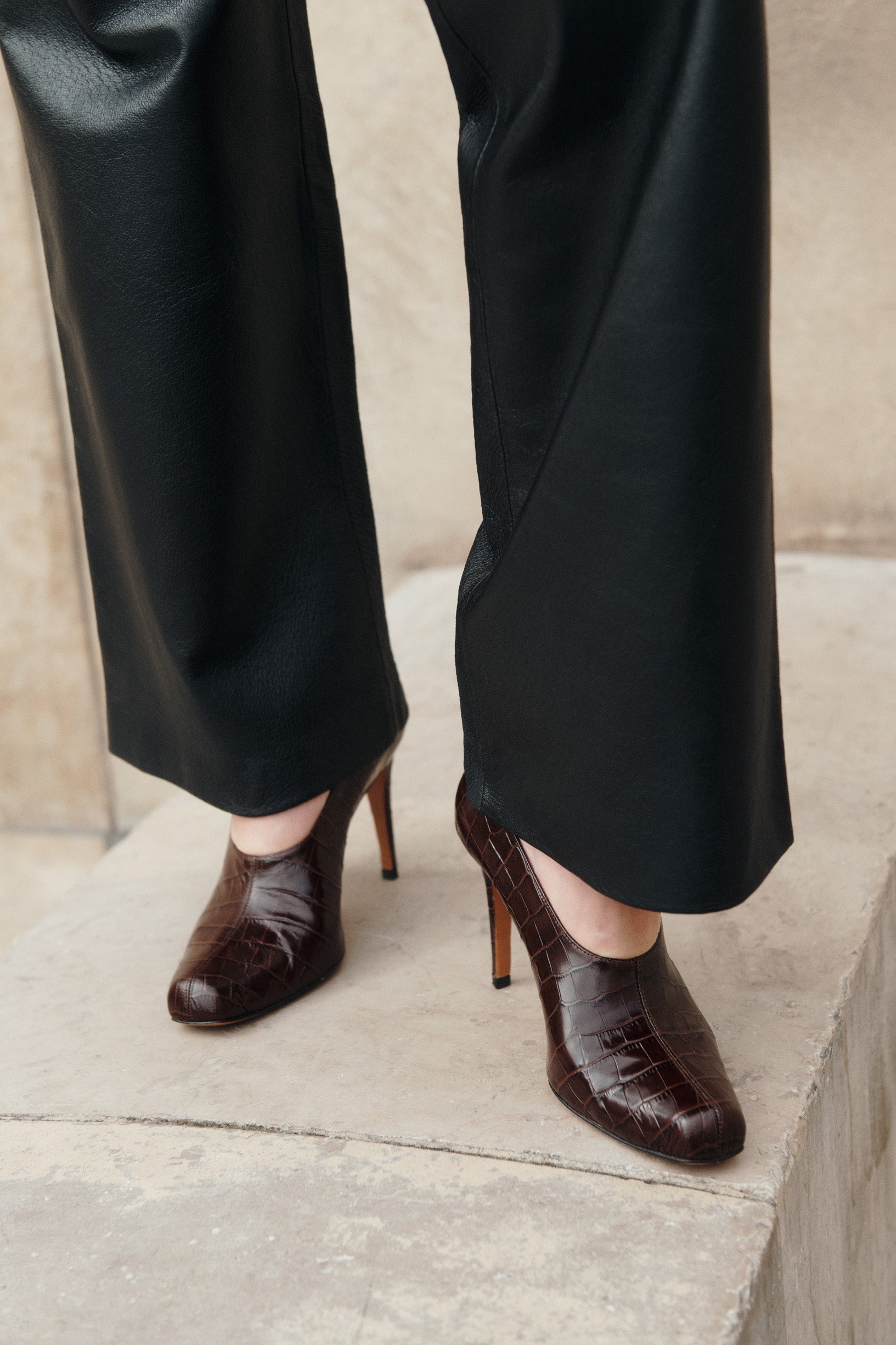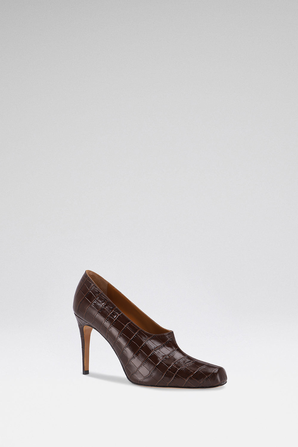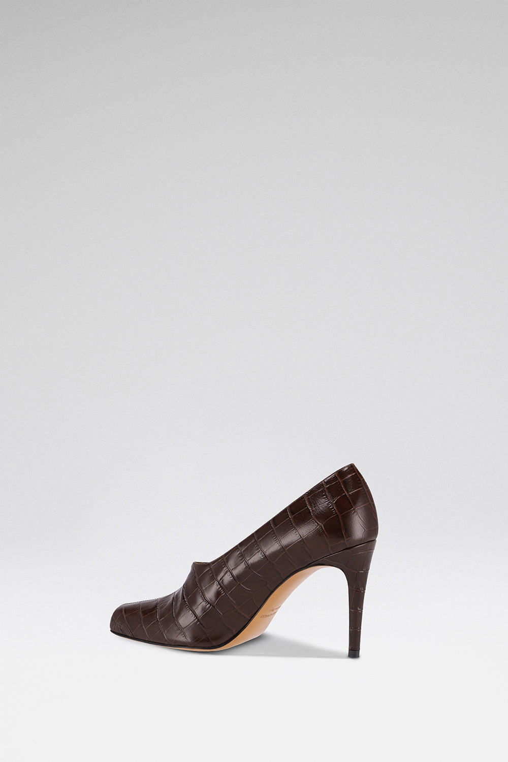 Chocolate crocodile-embossed leather. 85mm heel. A sculpted pump that sits just below the ankle. Finished by hand in Italy.