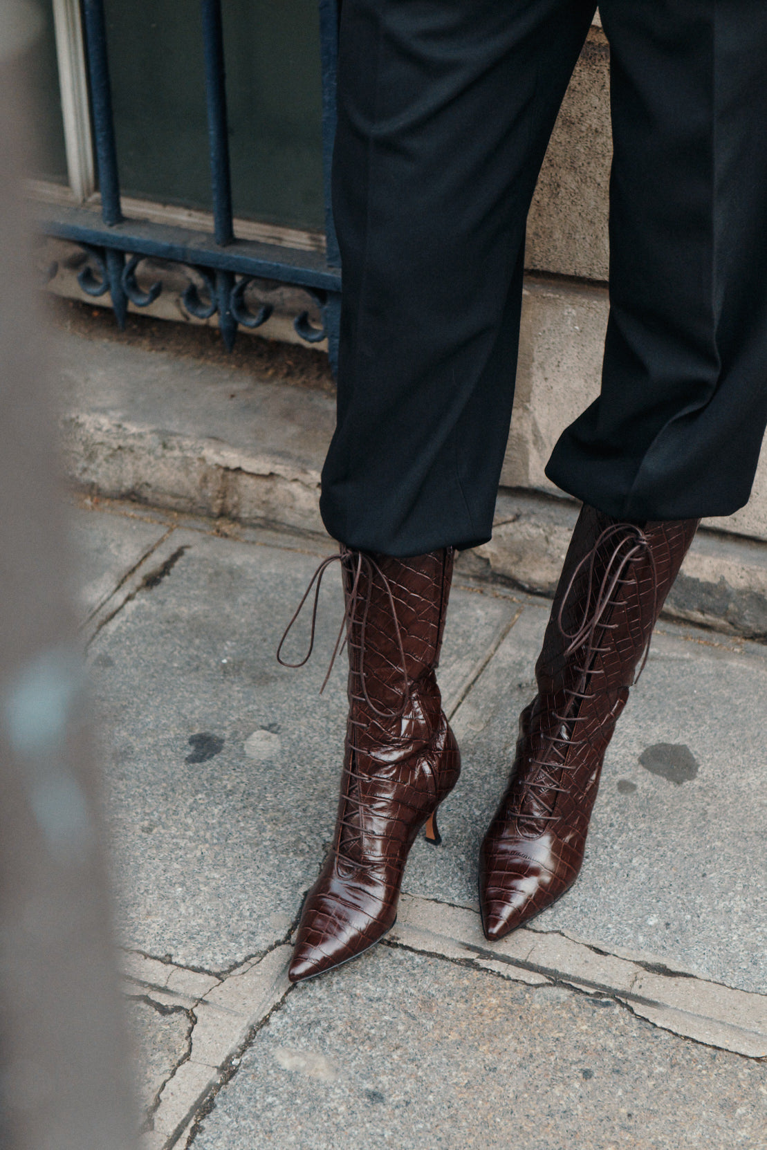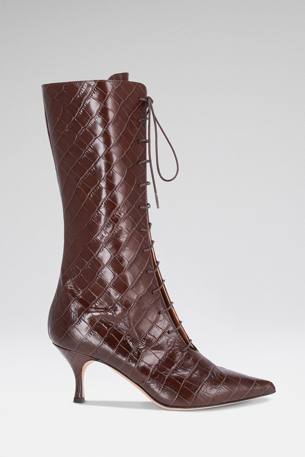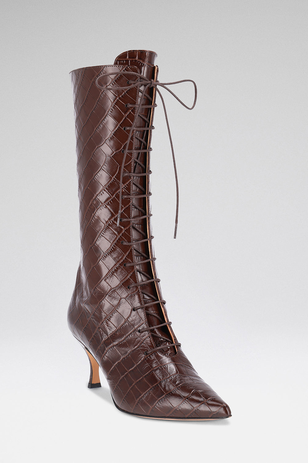 Chocolate crocodile-embossed leather. Tall pointed-toe boot with front lacing and side zipper. 70mm heel. Finished by hand in Italy.